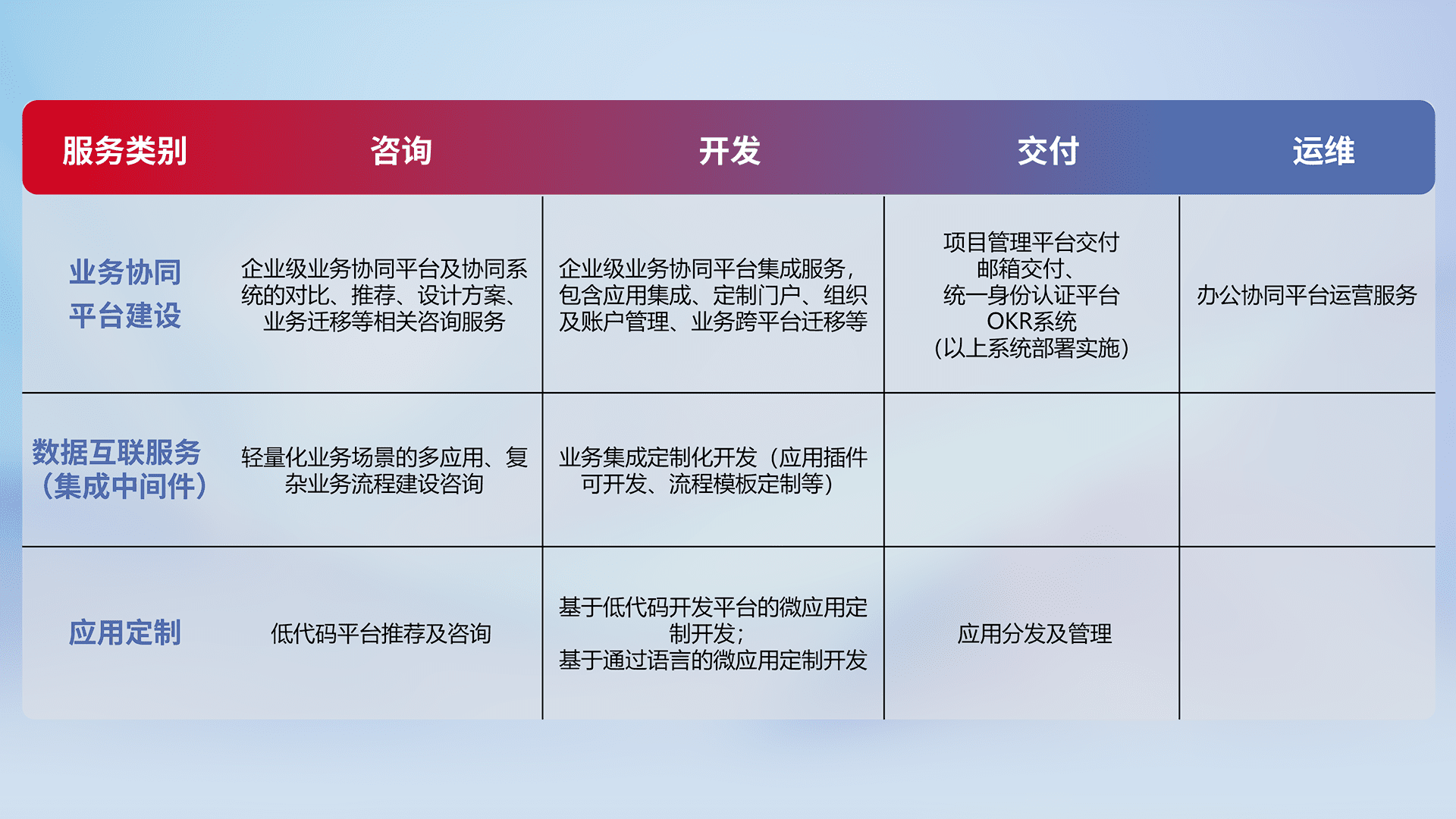 基于全代码低代码的数字化应用系统开发及交付,,,,满足特定业务场景的应用开发及集成,,,提升企业业务信息化及数字化能力。。