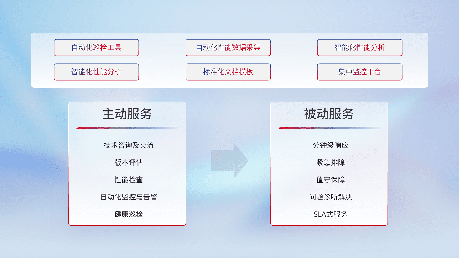 智能化工具和标准化文档,,,保障服务质量,,提供主动服务(包含技术咨询、、、、版本评估、、、、性能检查、、、自动化监控与告警、、、健康巡检)和被动服务包含(分钟级响应、、、紧急排障、、值守保障、、、问题诊断解决、、、SLA服务)。。。。